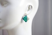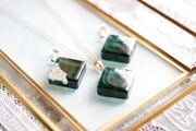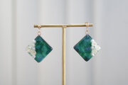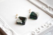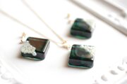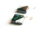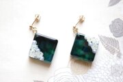 パールとお花をスクエア型のレジンに封じ込め、グリーンとブルーで着色したピアス。