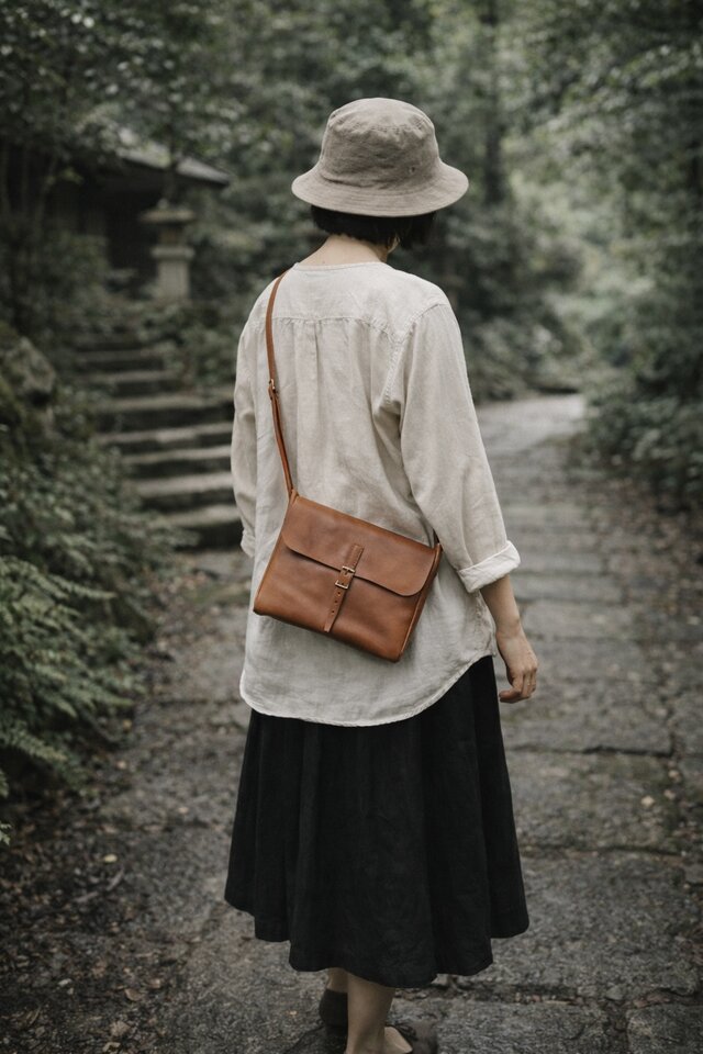 本革 スモールメールショルダーバッグ レンガ 牛革 タンニンレザー 背面ポケット付き ユニセックス