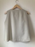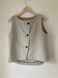 ウールのコート地で、短めのベストを作りました。アシンメトリーの打ち合わせで、少しななめに並んだボタンがアクセントになっています。コート用の生地なので、ぼってりしないように丈を短めにして、見返しは別布を使いました。一重ですが、とても暖かいです。