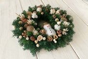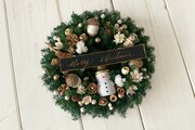 ヒムロスギとブルーアイスをベースに、スノーマンやどんぐりなどのオーナメントをアレンジした小さめの可愛いクリスマスリース。