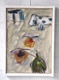 庭に成った柿と自分で作った紙粘土の犬がモチーフ。おっとりした感じの絵です。気にいる人がいれば幸いです。
