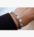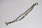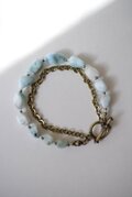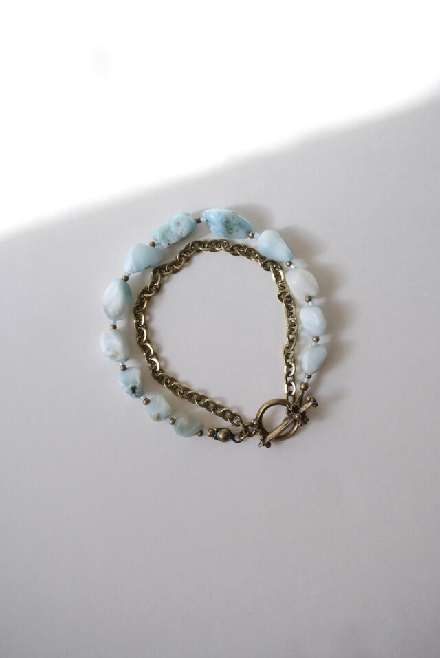 やや大粒のラリマー原石に真鍮チェーンを組み合わせたアンティーク風大人のブレスレットです。2種類のビーズを組み合わせ、チェーンを重ねることでこれからの季節にぴったりのボリューム感があります。