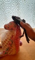 首輪付近に数本の指を入れる穴があいています。指を入れてねこをなでなでしてください。ウ―ル100%のやわらかい肌触りです〇