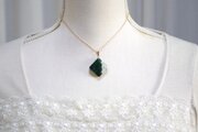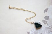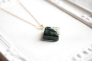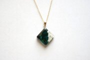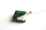 パールとお花をスクエア型のレジンに封じ込め、グリーンとブルーで着色したペンダント。