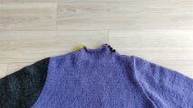 モヘア入り毛糸のメリヤス編み。袖口と裾周りはモール糸です。