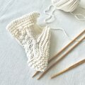 薄茶色のオーガニックコットンリネンで編みました。三つ編み模様が赤ちゃんの足をやさしく包み込むように編み上げました。