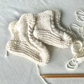 生成りのオーガニックコットンで編みました。三つ編み模様が赤ちゃんの足をやさしく包み込むように編み上げました。