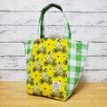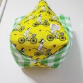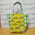 自転車に乗った犬さん柄×ブロックチェック柄で4枚はぎのころっとした大きめバッグを作りました。