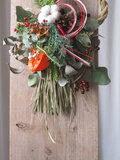 ドライフラワーなのですが、色彩に富んでいて、オレンジ色の木の実や、ブラウンのお花や松ぼっくりが、秋を感じさせてくれます。また、箱を開けた時の、ユーカリの葉のとても良い香りも、嬉しかったです。今回も、素敵なリース、ありがとうございました。