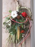 ドライフラワーなのですが、色彩に富んでいて、オレンジ色の木の実や、ブラウンのお花や松ぼっくりが、秋を感じさせてくれます。また、箱を開けた時の、ユーカリの葉のとても良い香りも、嬉しかったです。今回も、素敵なリース、ありがとうございました。