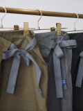 後ろのみ幅広のゴムを使用しています。ファスナーは付いておらず、補助の紐で調節できるようになっています。お腹周りを一旦右に畳み、紐でサイズを調節。左側に折り返し、お腹を包むようにしてサイドの紐で結んで完成です。