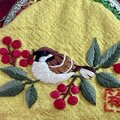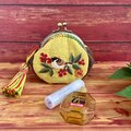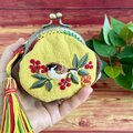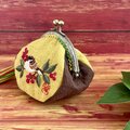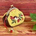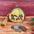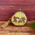 「難を転ずる」の語呂から、古くから縁起のいいものとされている南天と、一房の南天をくわえた様子が愛らしい雀を刺繍したがま口です。