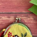 ふっくらした雀さんが南天にちょこんととまっている姿を刺繍したがま口です。