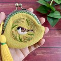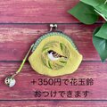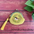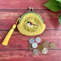 一房の稲をくわえた様子が愛らしいふくら雀を刺繍したフラットタイプのがま口です。