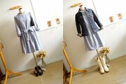 ウエスト切り替えのギャザーワンピースに高さ控えめのスタンドカラーを設え、