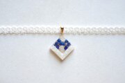 透明のレジンにホワイトシェルとラピスラズリのさざれを沈め、光沢のあるホワイトで囲ったレジンを、サテンリボンにタティングレースで装飾を施したチョーカーに仕上げました。