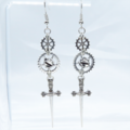 アンティークシルバーの深みのある輝きを纏い洗練されたシルエットの剣と精緻な歯車が組み合わされたスリムなロングピアスです