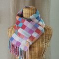 ピンクの濃淡、赤、オレンジ、青、白を組み合わせていますが、たて糸とよこ糸が交差することで、ニュアンスのある色味も現れています。