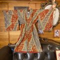 重厚な赤茶と墨色に、金彩を思わせる繊細な線が浮かぶこのワンピース。小花や蝶、唐草模様が織りなすその意匠は、和の伝統と異国情緒が入り混じる不思議な魅力を放ち、まるでどこか遠い時代の旅人のような空気を纏わせてくれます。