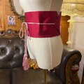 名古屋帯の素材感を活かし、洗練された和の美をまとったサッシュベルト。落ち着いた紅色は、まるで熟した果実のように奥行きがあり、装いに優雅な印象を与えます。