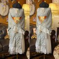 淡いブルーグレーを基調とした地に、流れるように描かれた無数の葉が重なり、まるで風の中でささやく植物たちのような幻想的な着物を使用した、2wayリメイクワンピース&ガウン。