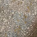 繊細な黒の輪郭線と淡い色調の重なりの中に、ところどころ金彩がふわりと光り、控えめながらも高貴な存在感を放ちます。