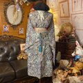 黒を基調にした地に、生成りの葉が繊細に描かれ、そこに淡いミントグリーンの花がひそやかに咲く。まるで夜明け前の庭園を思わせる、静かで奥深い表情の着物から生まれたリメイクワンピース。。
