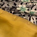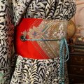 コーディネートのアクセントには、朱赤の帯ベルトを。豪華な織りと金糸の刺繍が施された帯地が、ワンピース全体の雰囲気を引き締め、上品な華やかさをプラス。格式と遊び心を兼ね備えた、現代の和洋折衷スタイルにぴったりの一着です。