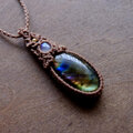 ラブラドライトの中でも珍しいパープル、オレンジ、イエローに輝くラブラドレッセンス(シラー)が神秘的で印象的なマダガスカル産ラブラドライトのマクラメ編みペンダントネックレスです。