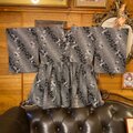 一面に降り積もるような細かな文様と、淡く浮かぶ桜の花が美しい、シックな着物をリメイクした1着。