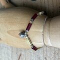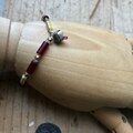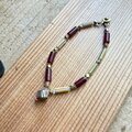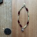 濃い赤のパイプビーズ、細長いビーズ二種をベネチアのクリアの小さなシードビーズと真鍮の十四角形のアナスヤジーズ(現行品)で繋ぎました。