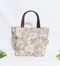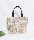 上品で優しい色合いのベージュ地にクラシックフラワー柄のミニトートバックです。