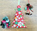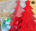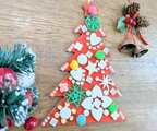 真っ赤に色付けされたツリー型の木のベースにタイルやフエルト、カラフルなポンポンやキラキラで飾り付けができるキットです。