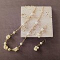 カゼイン樹脂でできたボーン型のビーズを組み合わせて作ったぽこぽことしたこんぺいとうのようなパーツがアクセント。3種類のチェコガラスを織り交ぜながら、アイボリーやパール系のやさしい色合いでまとめました。