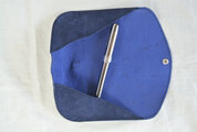 薄くて柔らか、濃いめのブルーのスエード(豚革)で作ったロール型のペンケースです。