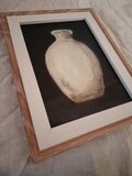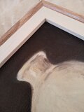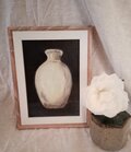 このオリジナル油絵は、マツダの最高級日本製油絵具を用いて、5×7インチ(約12.5×16.5cm)の小さなキャンバスボードに描かれています。写真の通り、取り外し可能なシンプルな樹脂製フレームは、それぞれのサイズに若干の余裕を持たせており、紐が付いているのですぐに壁に掛けられます。
