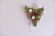 タペストリーの様なモダンな形に針葉樹や綿の実、野バラの実など、冬色のお花をアレンジしました。