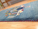 グラデーションのきいたインディゴブルーの地に、生命力あふれる孔雀が描かれている、手織りのペルシャギャッベミニランナーのご紹介です♪