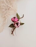 ピンク系に染めた丸い薔薇に葉を添え、ベージュベルベットリボンを結び、スタイリッシュでお洒落なコサージュに仕上げました。