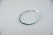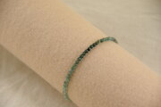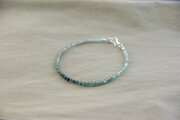 極小サイズのトルマリンを繋いだ繊細な印象のブレスレットです。写真ではグリーンのように見えますが、実際は青色のグラデーションが美しいブルートルマリンです。小さいながらも粒は揃っており、透明感も素晴らしい質の良い天然石です。ブルートルマリンは別名「インディゴライト」と呼ばれ、精神的に成長したいときに大きな助けになります。