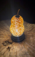 せんなりひょうたん全体に0.5ミリから3ミリの穴を開けたり透かし彫りにしたりでモザイクのような煌めくひょうたんランプにしました。