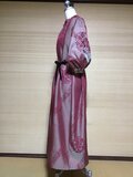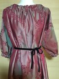 柔らかな光沢のあるグレイッシュなピンク地にワインローズの花模様が浮かぶ上品な色合いのワンピースです。