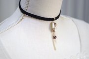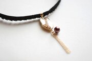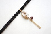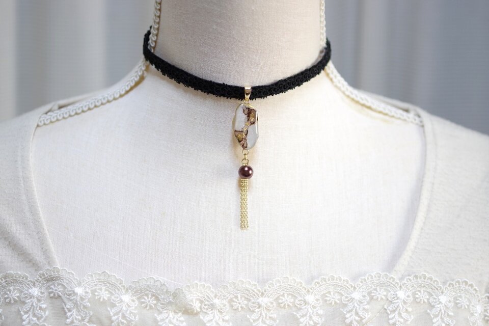 スライスアゲートのような光沢のある白いレジンにブラウンの模様を描き、ガラスパールとフリンジを添え、ベルベットリボンにタティングレースで装飾を施したチョーカーに仕上げました。