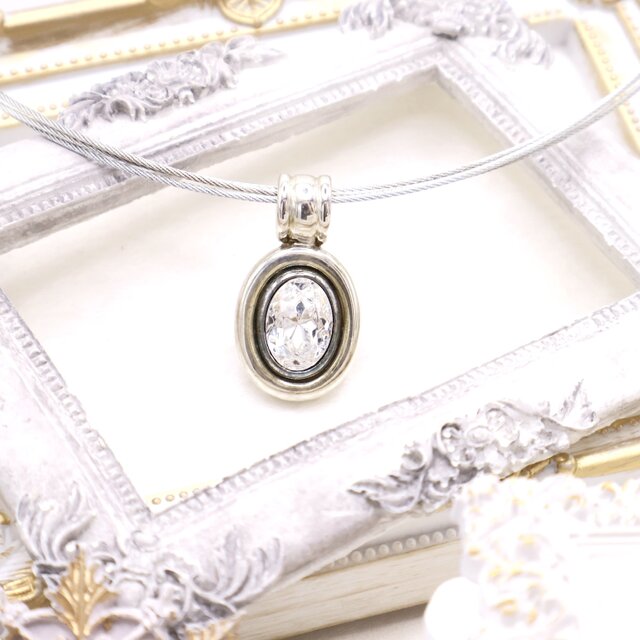 透明度の高いクリアオーバルストーンを、艶やかなシルバートーンのフレームに包み込んだ、