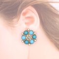 アメリカで買い付けた、ターコイズブルーとアイボリーパールビーズが組み合わされたフラワーモチーフのピアス。