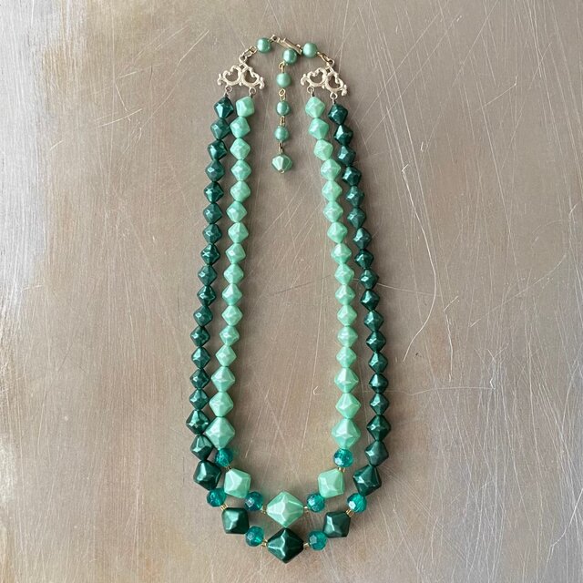 クラシカルな雰囲気のUSAヴィンテージネックレス。2色のグリーンのビーズがマッチした上品なデザイン。留め具はヴィンテージならではのフックタイプです。パーリーな輝きがお顔まわりを華やかに彩ってくれます。