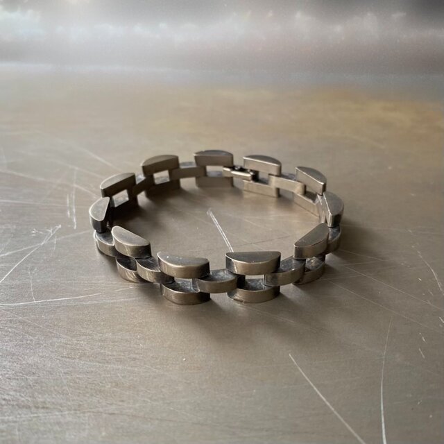 レトロモードな雰囲気のシルバー製USAヴィンテージブレスレット。重厚感のあるしっかりとした作りとシンプルながら個性的なチェーンが特徴的。存在感があり古着など様々なスタイルに合わせて頂けます。シルバー製ですのでお手入れをすることで長くお使い頂けます。
