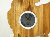 ウェルシュ・コーギーの姿を模った木製のデジタル温・湿度計(時計付)です。