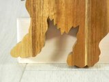 意匠をウェルシュ・コーギーのシルエットのみとして、材のアカシア集成材の木目と木組みのモザイク模様を活かしてインテリアとして飽きのこない作りとしています。