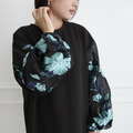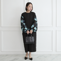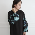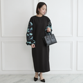 甘さを抑えたブラックに、花柄シアースリーブが上品に映える一着。体のラインをひろわず、着るだけで「きちんと感」と「女性らしさ」を両立できる大人のためのワンピースです。